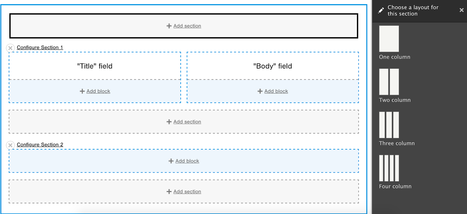 Il modulo Layout Builder consente la personalizzazione dei layout di pagina utilizzando un'interfaccia drag'n'drop. Puoi personalizzare una singola pagina o creare un modello per tipi di contenuto specifici.